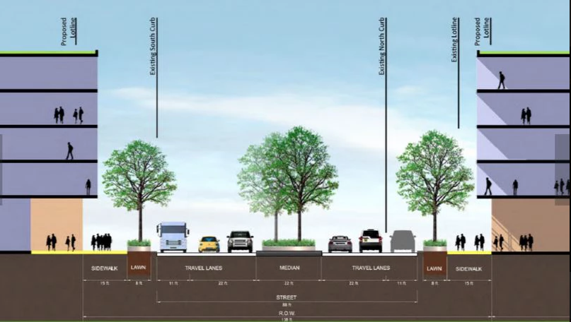 This rendering shows what the "grand boulevard" version of MLK Drive will look like between Highland and Eden Avenues.
